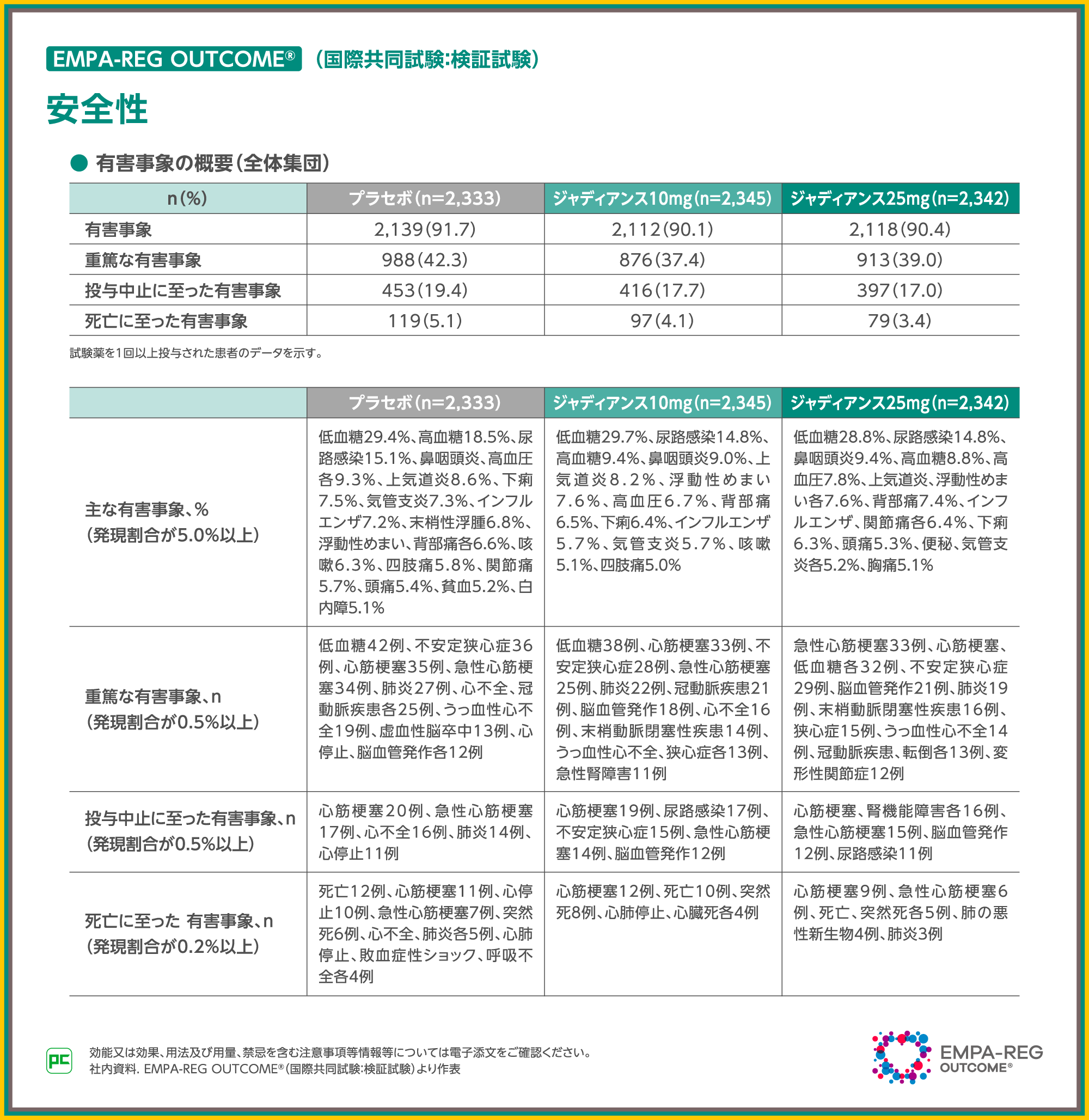 投与中止に至った有害事象は、それぞれ4.6%(3/65例)、4.7%(3/64例)、重篤な有害事象はそれぞれ12.3%(8/65例)、12.5%(8/64例)、死亡に至った有害事象はプラセボ群1.6%(1/64例)で、ジャディアンス10mg群では報告されませんでした。