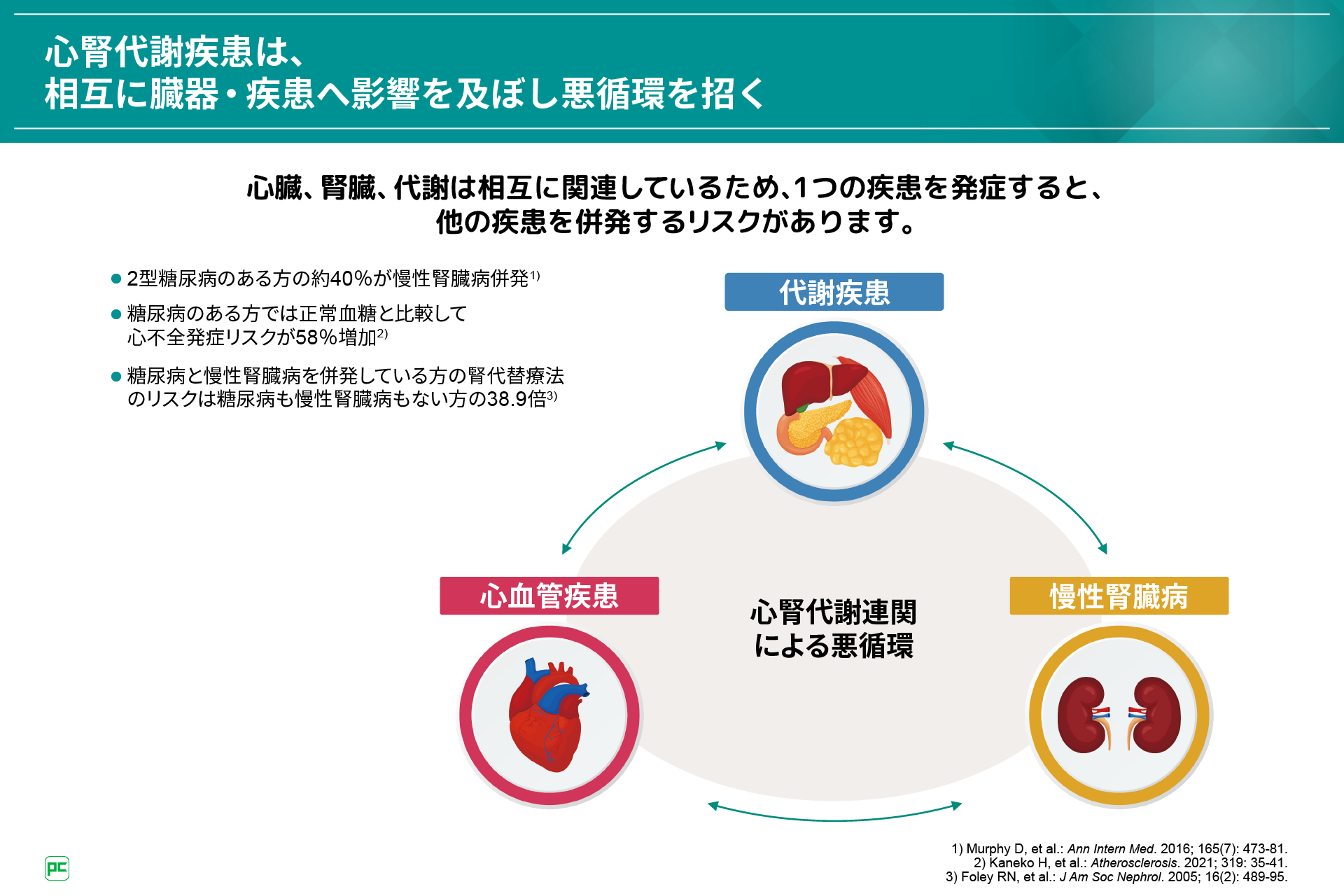 先生もご存じのとおり、心臓、腎臓、代謝は、相互に関連しており、1つの疾患は他の臓器・疾患へ影響を及ぼし悪循環を招きます。