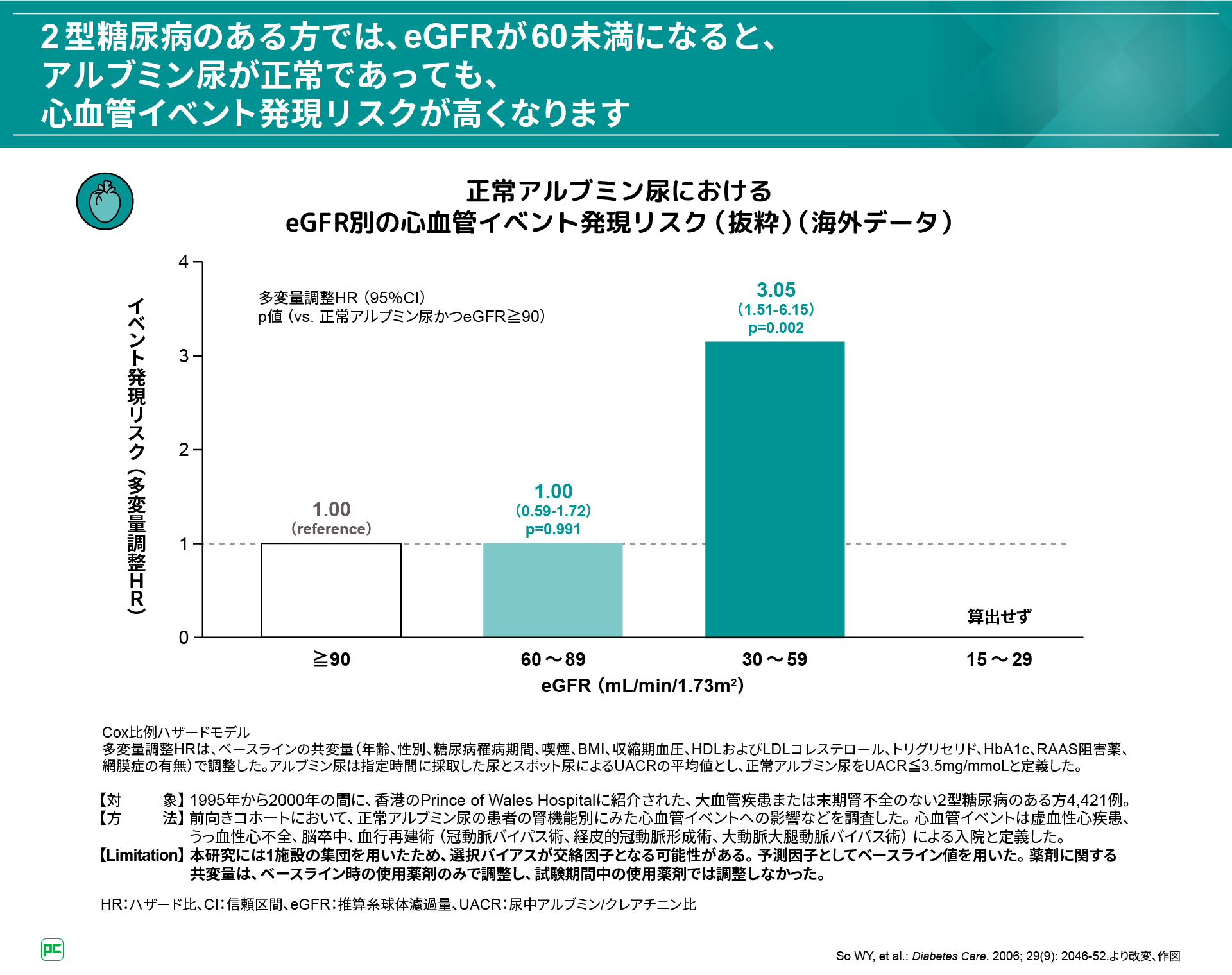 その結果、eGFR 30~59mL/min/1.73m2群の心血管イベント発現リスクは、eGFR≧90mL/min/1.73m2群の3.05倍だったことが報告されました。
