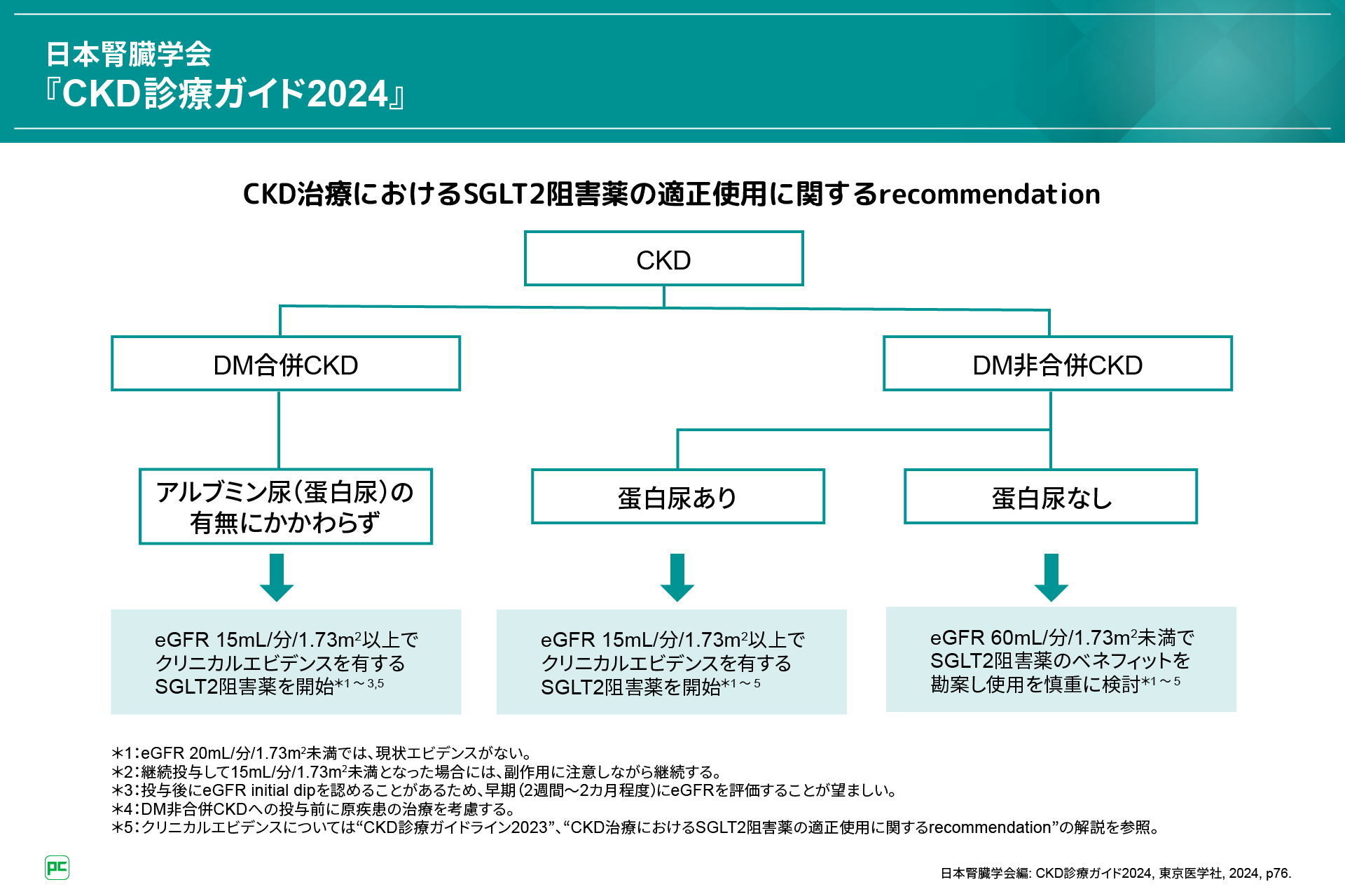 先生のご選択のとおり、『CKD診療ガイド2024』では、糖尿病を合併するCKD患者に対しては、アルブミン尿(蛋白尿)の有無にかかわらずSGLT2阻害薬を開始するとされています。