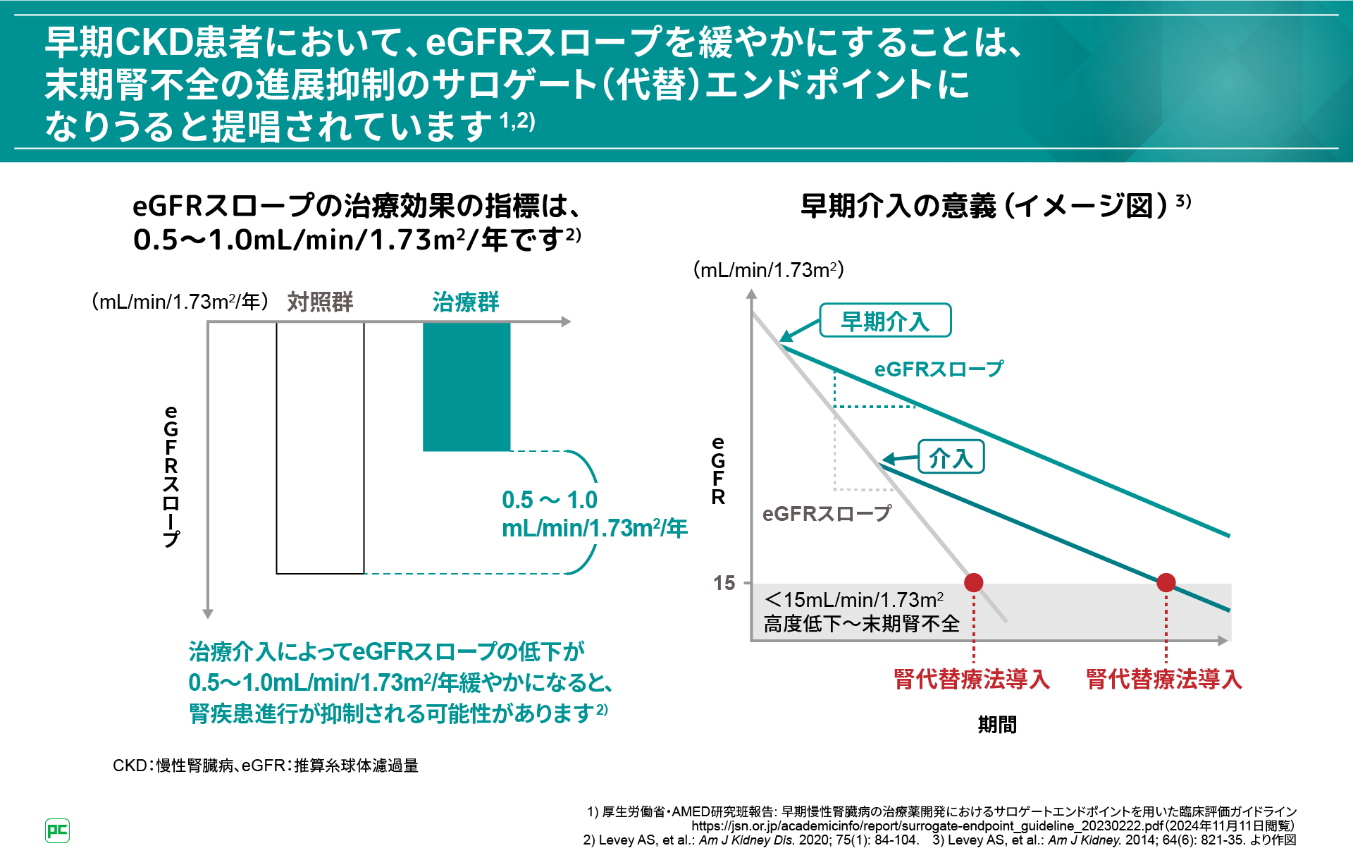 また、早期CKD患者において、eGFRスロープを緩やかにすることは、末期腎不全の進展抑制のサロゲート(代替)エンドポイントになりうると提唱されています。
