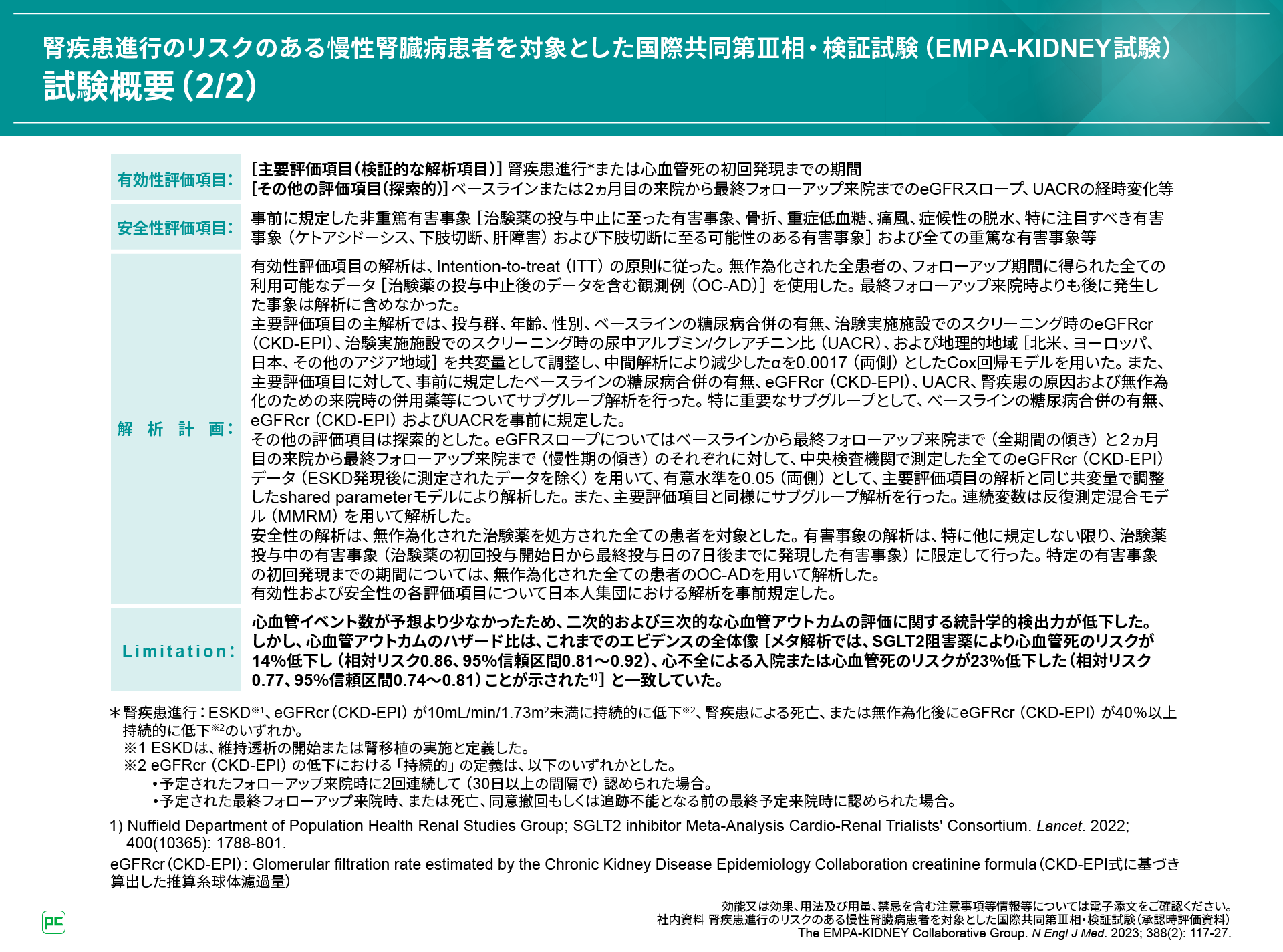 本試験は、腎疾患進行のリスクのあるCKD患者6,581例を対象に、ジャディアンス10mgを1日1回経口投与した時の腎疾患進行または心血管死の初回発現までの期間に対する有効性および安全性をプラセボと比較検討しました。また、対象患者のうち584例が日本人でした。