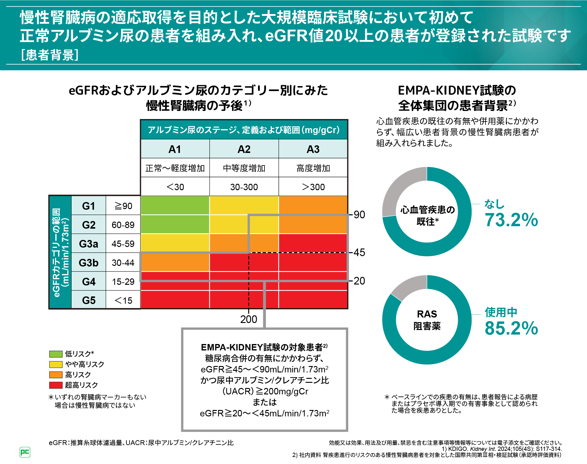 本試験は、CKDの適応取得を目的とした大規模臨床試験において初めて正常アルブミン尿の患者を組み入れ、eGFR値20以上の患者が登録された試験です。また、心血管疾患の既往の有無や併用薬にかかわらず、幅広い患者背景のCKD患者が組み入れられました。