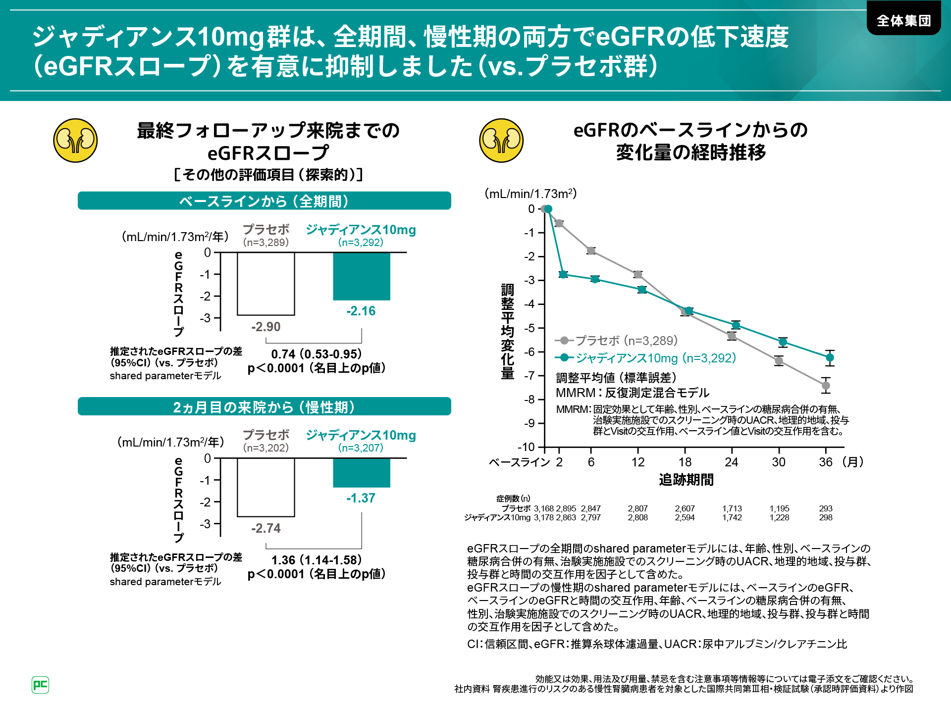 その結果、ジャディアンス10mg群はプラセボ群と比べて、全期間※2、慢性期※3の両方でeGFRスロープを有意に抑制しました(いずれもp<0.0001、名目上のp値、shared parameterモデル)。
