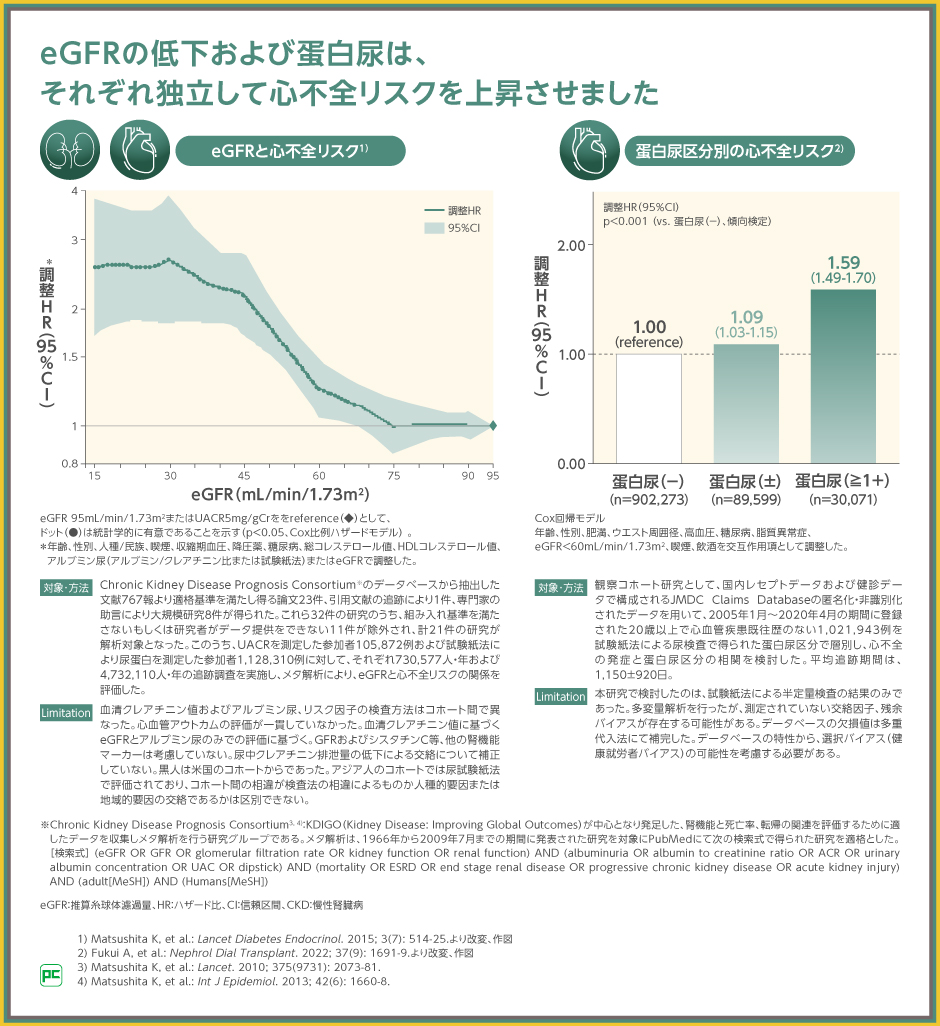 そのことを示すように、心不全患者が慢性腎臓病を合併すると全死亡や心不全による入院のリスクが、慢性腎臓病患者が心不全を合併すると死亡リスクが、それぞれ上昇することなどが過去の疫学研究で示されています。