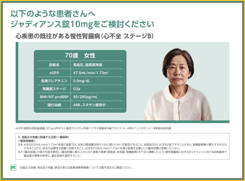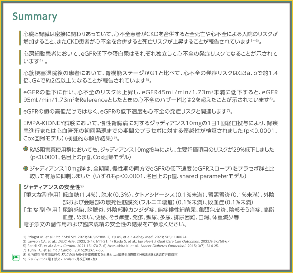 ご紹介したように、CKDにおける心血管イベントリスクを考慮した場合、特に心疾患既往歴のある患者においては、心腎連関の観点から慢性腎臓病治療が求められることがございます。その治療選択肢の一つとして、ジャディアンスをご検討ください 。