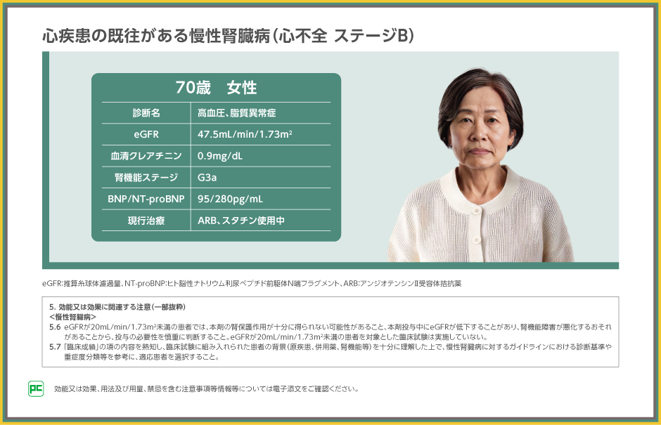 こちらの患者さんは心疾患の既往があり心不全ステージBで、慢性腎臓病と診断されています。