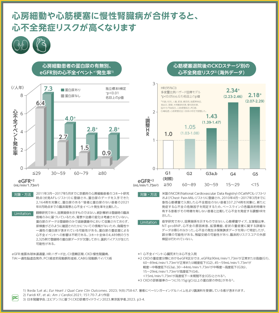 そのことを示すように、心不全患者が慢性腎臓病を合併すると全死亡や心不全による入院のリスクが、慢性腎臓病患者が心不全を合併すると死亡リスクが、それぞれ上昇することなどが過去の疫学研究で示されています。