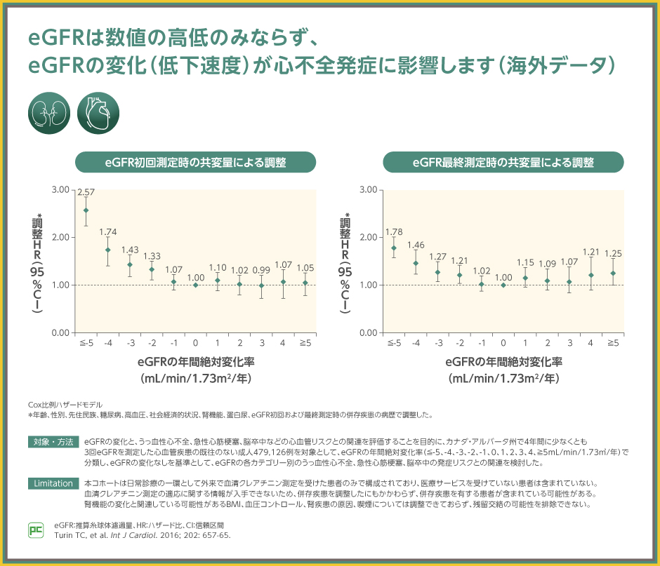 eGFRは値の高低だけではなく、eGFRの低下速度を示すeGFRスロープも心不全の発症リスクと関連します。