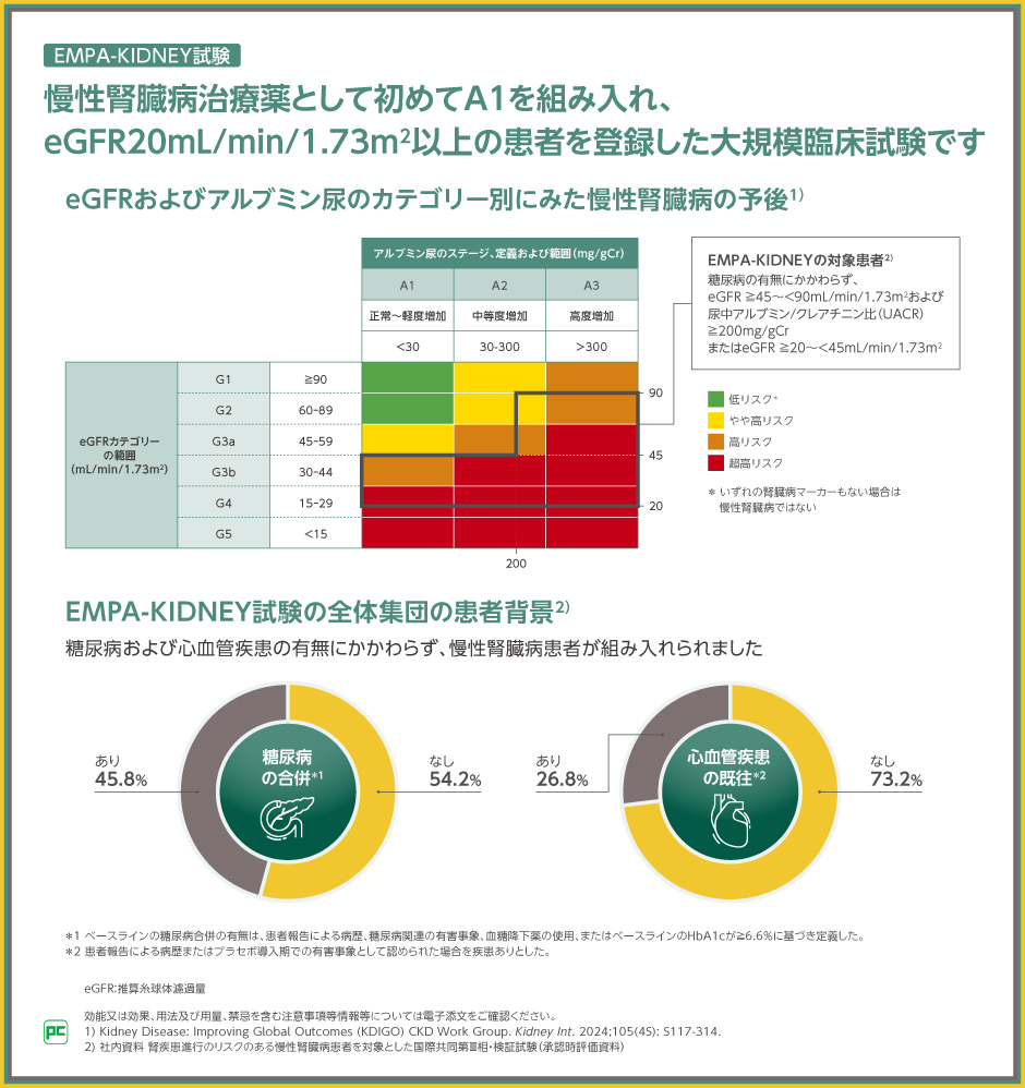 ジャディアンスは、EMPA-KIDNEY試験において糖尿病合併の有無を問わずCKD患者に対する有効性が示されました