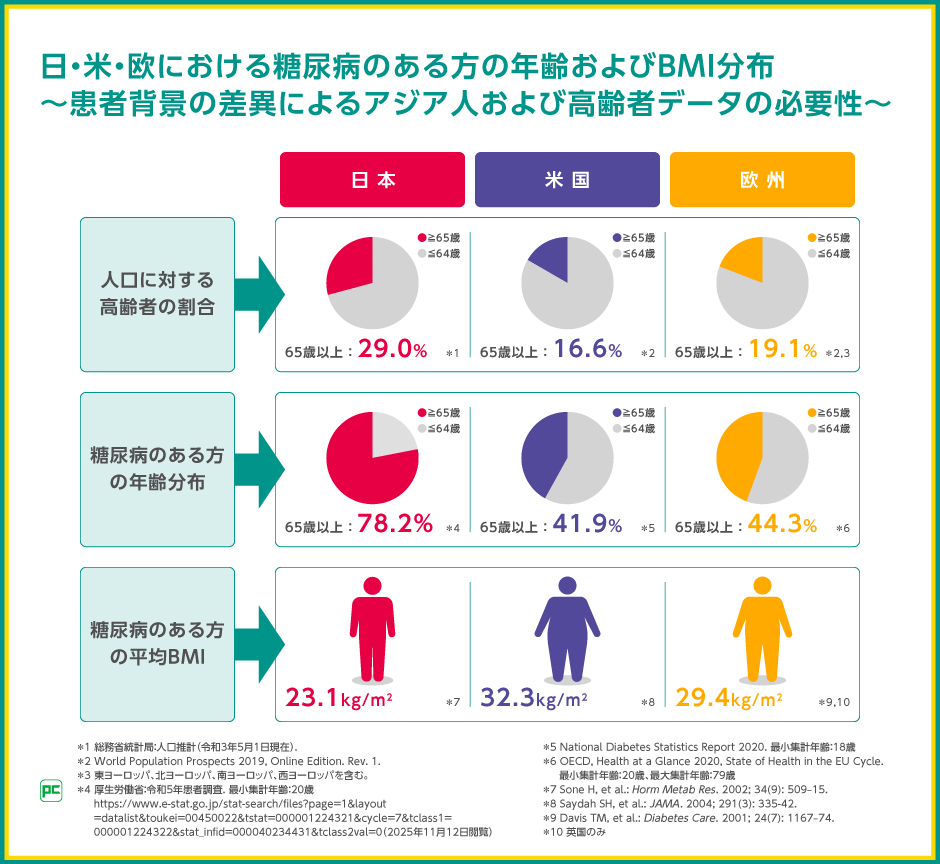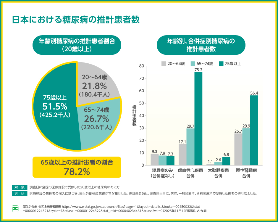 高齢社会となった日本では、糖尿病のある方においても高齢者の割合が欧米よりも高いことが報告されており、厚生労働省による患者調査では、糖尿病のある方の77.2%が65歳以上であると報告されました。