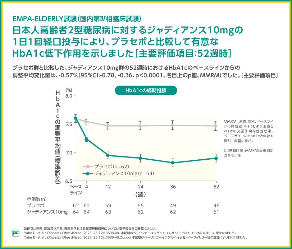 日本人高齢者2型糖尿病に対するジャディアンス10mgの1日1回経口投与による、プラセボ群と比較したジャディアンス10mg群の52週時のHbA1cのベースラインからの変化量は-0.57%であり、ジャディアンス10mg群で有意なHbA1c低下作用を示しました(p<0.0001、名目上のp値、MMRM)。
