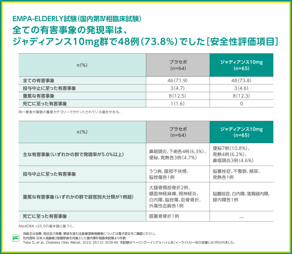 EMPA-ELDERLY試験における有害事象の発現率は、ジャディアンス10mg群で73.8%(48/65例)、プラセボ群で71.9%(46/64例)でした。