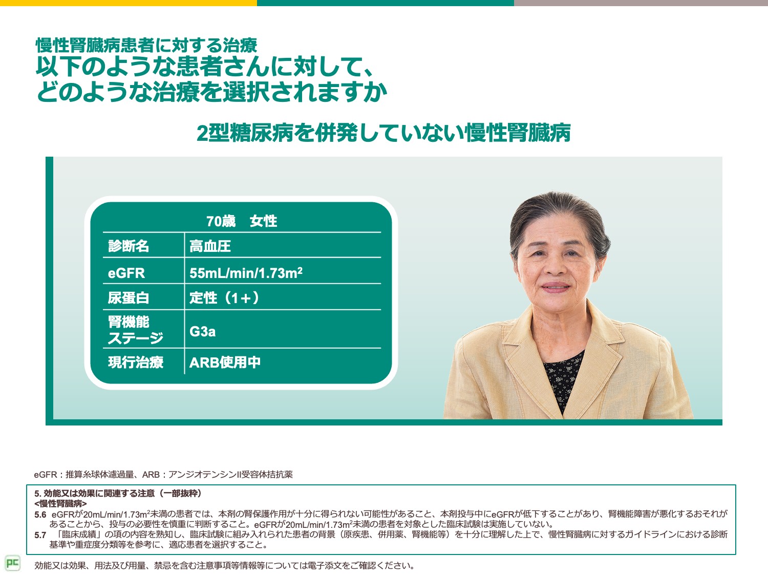 この患者さんのeGFRは55mL/min/1.73m2であり、蛋白尿は定性(1+)です。また、高血圧と診断されており、アンジオテンシンⅡ受容体拮抗薬(ARB)で治療中です。
