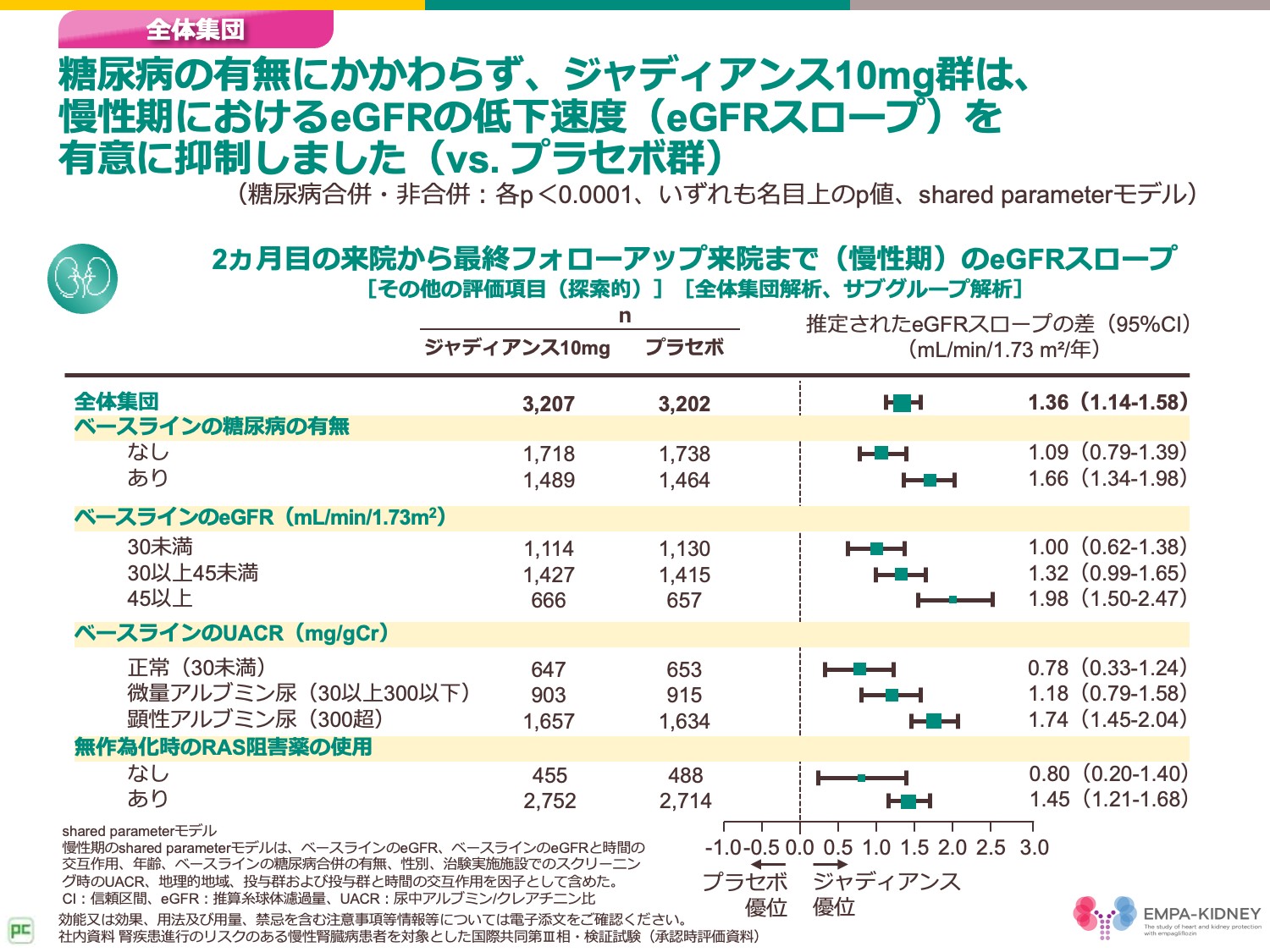 結果といたしましては、ジャディアンス10mg群のeGFRスロープの負の値は、糖尿病合併の有無にかかわらずプラセボ群よりも有意に小さくなりました。