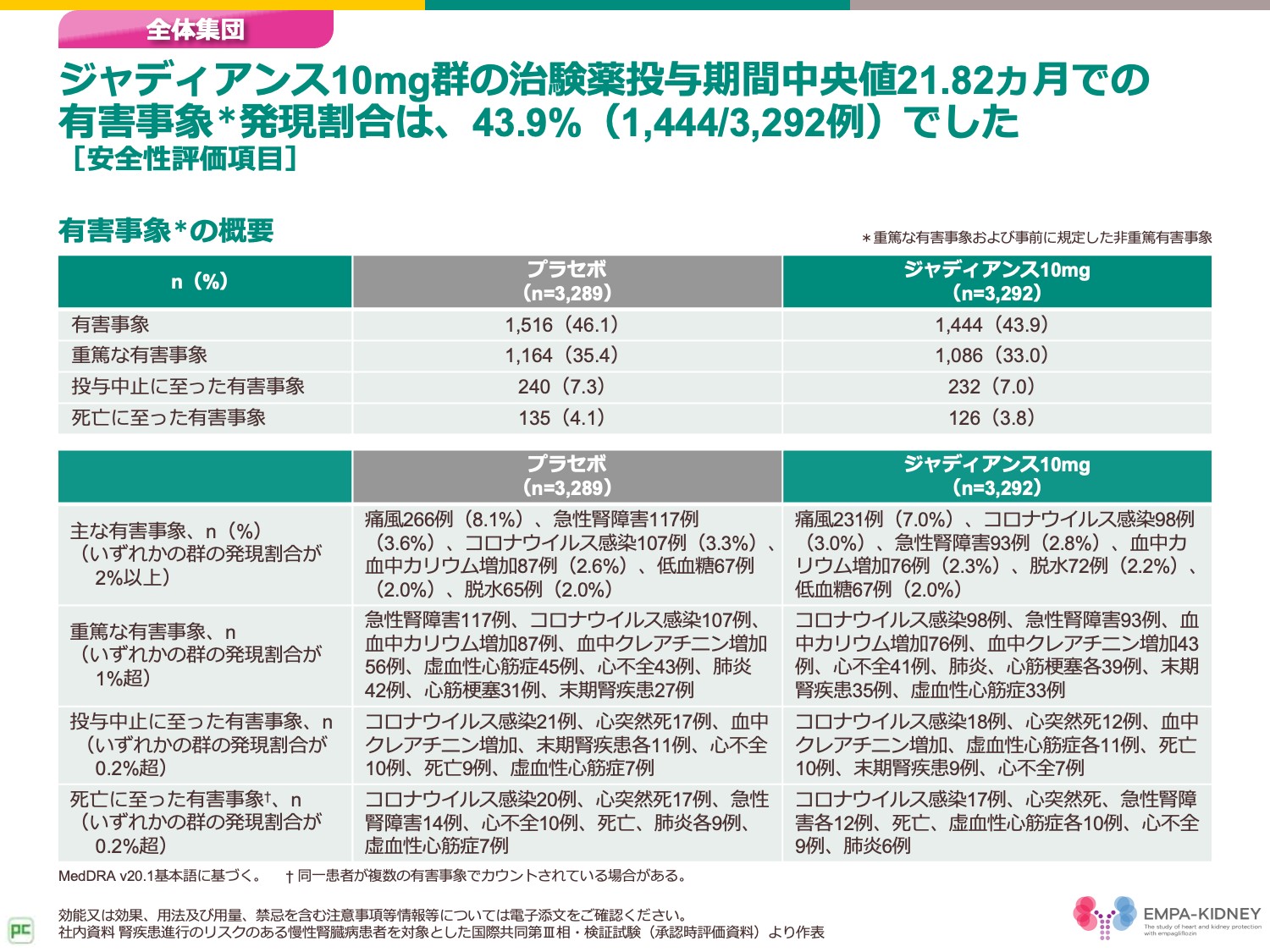 また、重篤な有害事象は、ジャディアンス10mg群でコロナウイルス感染98例、急性腎障害93例、血中カリウム増加76例等でした。
