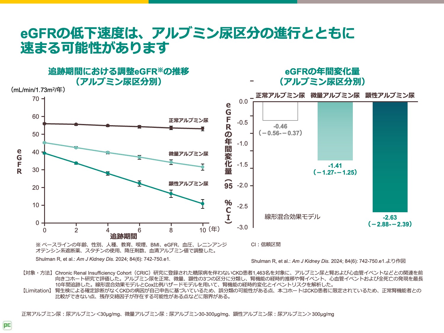 具体的には、正常アルブミン尿群ではeGFRの年間低下速度が-0.46mL/min/1.73m2であったのに対し、微量アルブミン尿群では-1.41mL/min/1.73m2、顕性アルブミン尿群では-2.63mL/min/1.73m2となっていました2)。