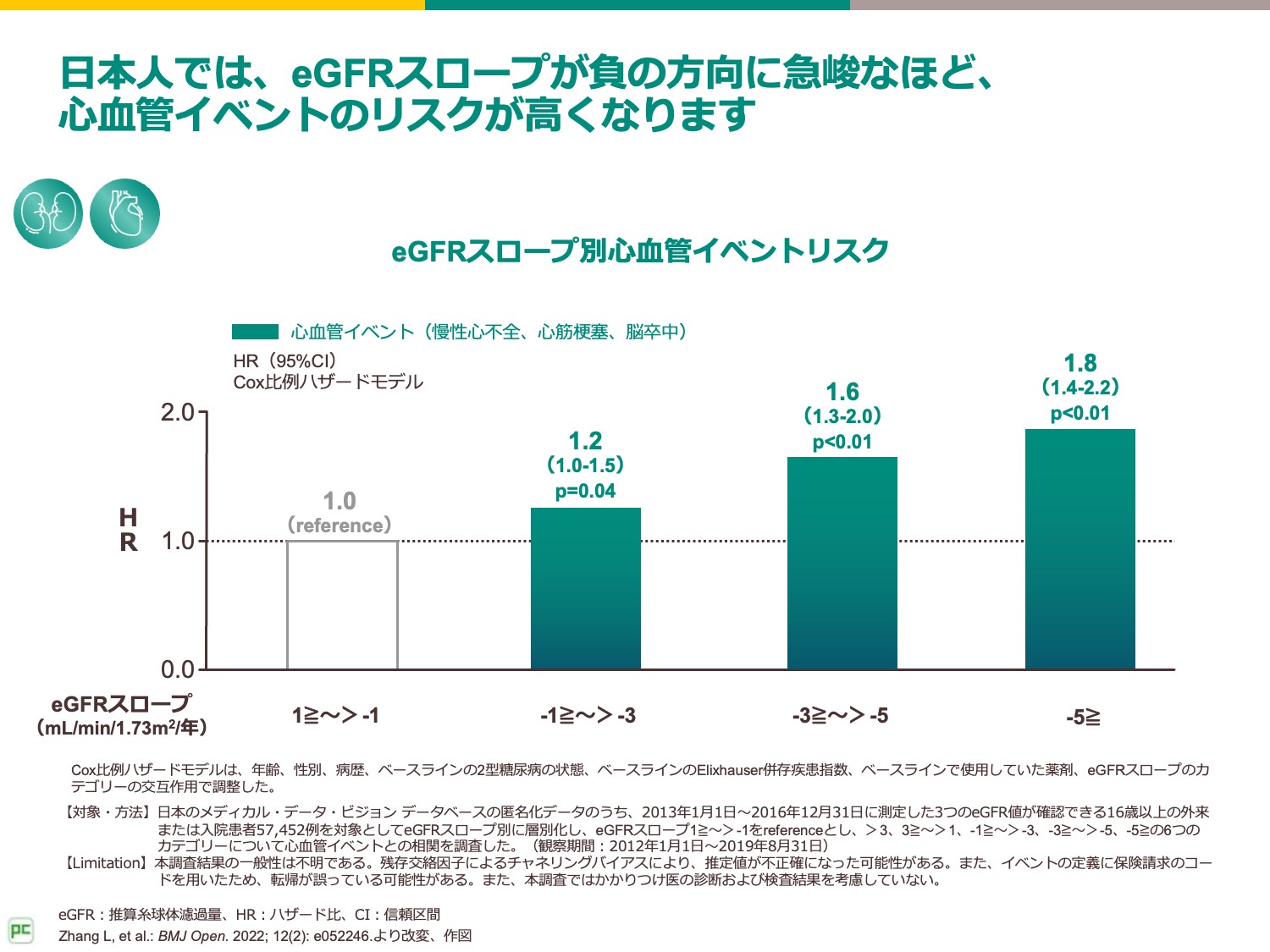 日本人のデータベースを利用した調査では、eGFRスロープが-1mL/min/1.73m2より大きく1mL/min/1.73m2以下である場合と比べ、-1mL/min/1.73m2以下の場合、すなわち負の方向に急峻なほど心血管イベントのリスクが高いことが示されました3)。