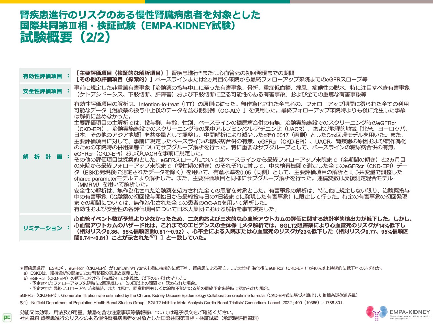 - 社内資料. 腎疾患進行リスクのある慢性腎臓病患者を対象とした国際共同第Ⅲ相・検証試験(承認時評価資料).