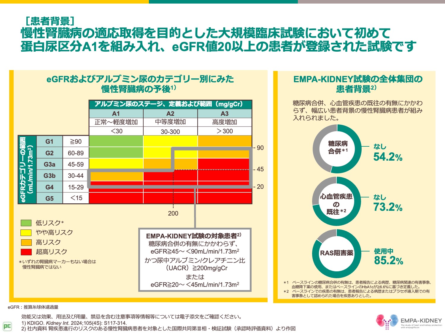 本試験の特性として注目いただきたい点は、慢性腎臓病の適応取得を目的とした大規模臨床試験において初めて蛋白尿区分A1を組み入れ、eGFR値20以上の患者が登録された点です。