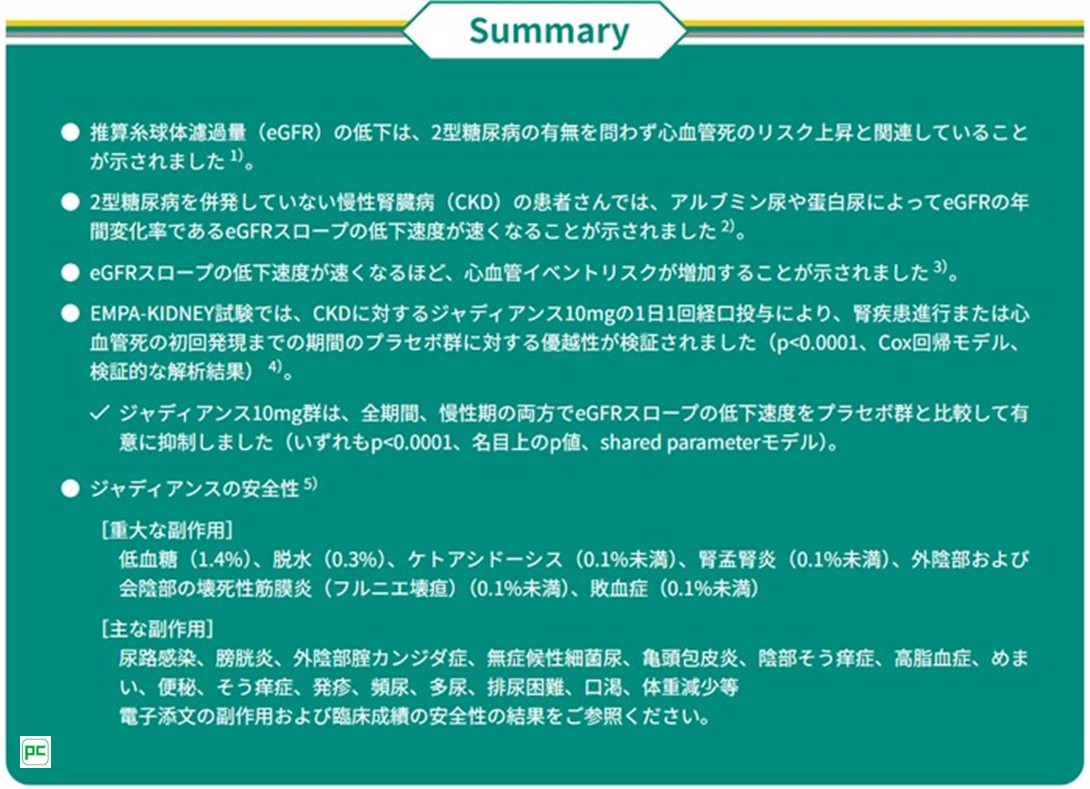 心血管イベントリスクを見据えた慢性腎臓病の治療選択肢として、ジャディアンス10mg※1をぜひご検討ください。
