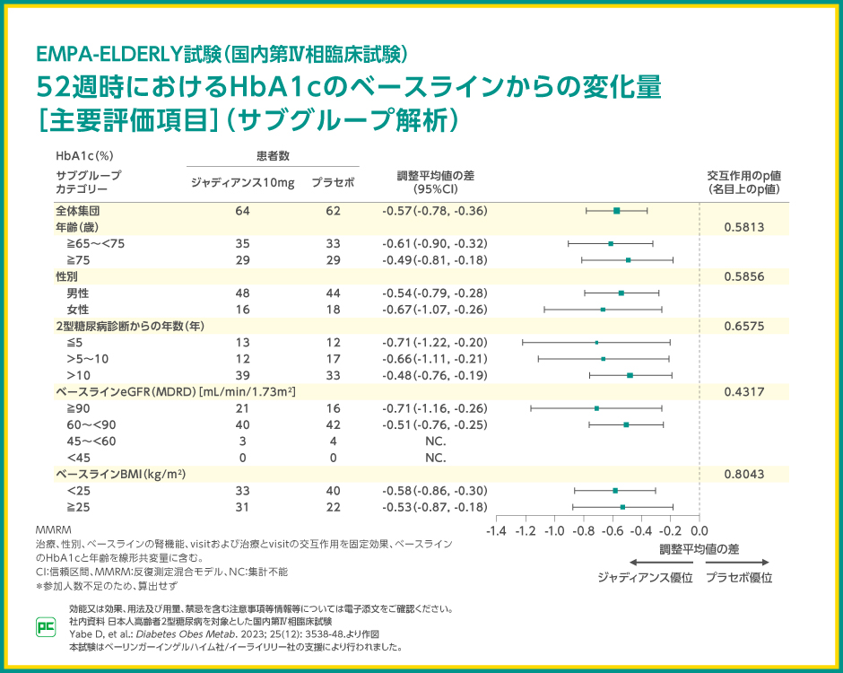 日本人高齢者2型糖尿病に対するジャディアンス10mgの1日1回経口投与による、プラセボ群と比較したジャディアンス10mg群の52週時のHbA1cのベースラインからの変化量は-0.57%であり、ジャディアンス10mg群で有意なHbA1c低下作用を示したことから(p<0.0001、名目上のp値、MMRM)、日本人高齢者2型糖尿病においてもジャディアンス10mg 1日1回投与による血糖改善効果が確認されました。
