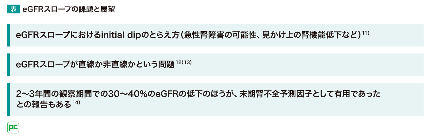eGFRスロープにはいくつかの課題も指摘されています(表)。