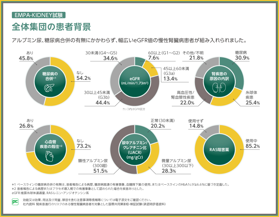 本試験にはアルブミン尿、糖尿病の有無にかかわらず、幅広いeGFR値の慢性腎臓病患者が組み入れられました。