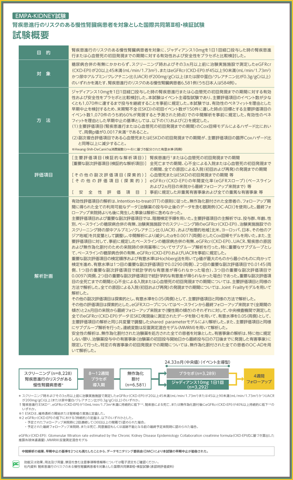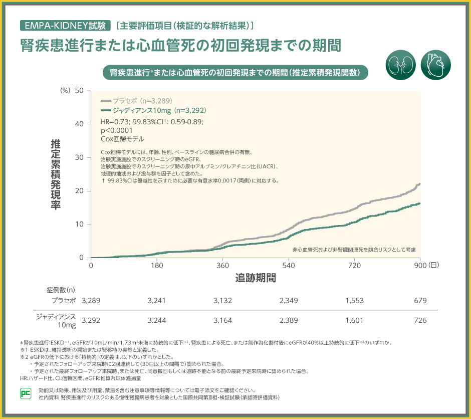 EMPA-KIDNEY試験は、腎疾患進行のリスクのある慢性腎臓病(CKD)患者を対象としたジャディアンスの国際共同第Ⅲ相・検証試験です。ジャディアンス10mgを1日1回経口投与した時の腎疾患進行または心血管死の初回発現までの期間に対する有効性および安全性についてプラセボと比較検討されました。