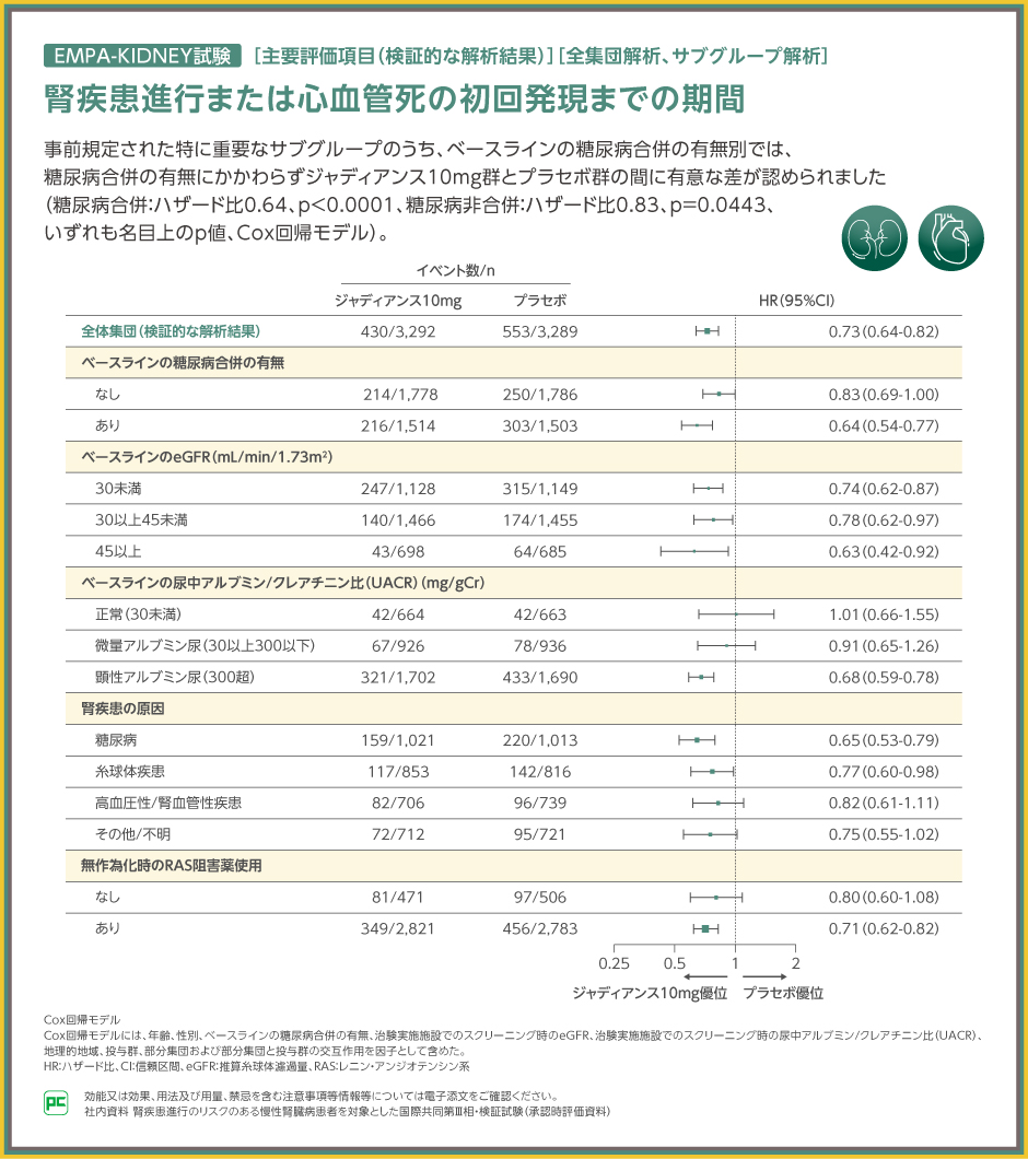腎疾患進行または心血管死の初回発現におけるサブグループ解析では、ベースラインのeGFR、糖尿病合併の有無およびUACRは、特に重要なサブグループとして事前規定されました。