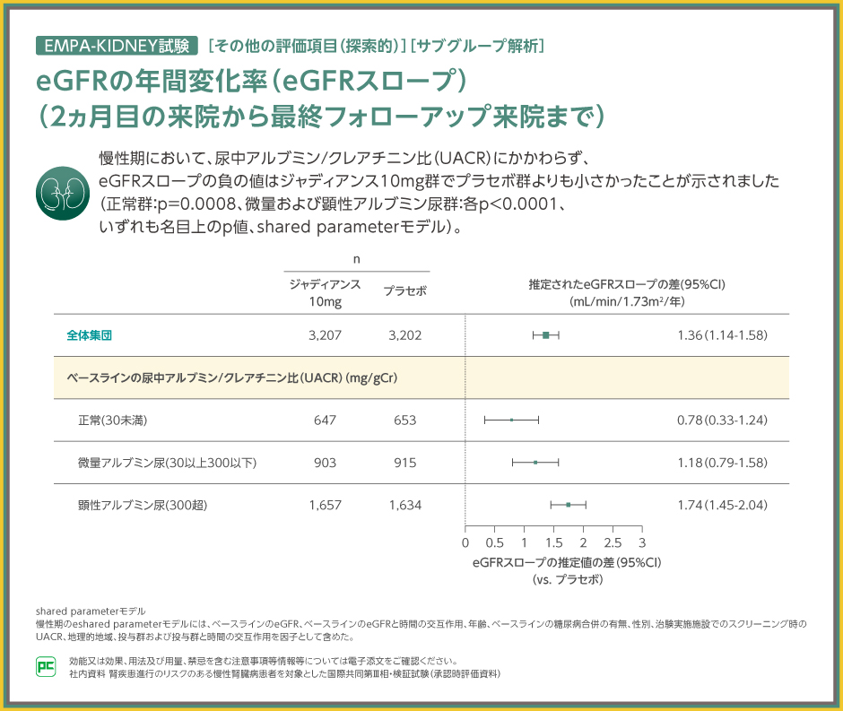 さらに慢性期におけるeGFRスロープにおいて、事前規定されたベースラインのUACR別のサブグループ解析の実施した結果、推定されたeGFRスロープの差から、ジャディアンス10mg群はUACRにかかわらず、プラセボ群に対してeGFRスロープの低下が小さかったことが示されました(正常群:p=0.0008、微量アルブミン尿群および顕性アルブミン尿群:各p<0.0001、いずれも名目上のp値、shared parameterモデル)。