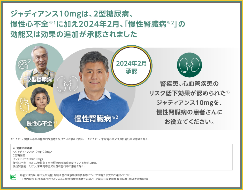 SGLT2阻害薬であるジャディアンス10mgは、2型糖尿病、慢性心不全※1に続き、2024年2月、「慢性腎臓病※2」 に対する効能又は効果が新たに追加承認されました。