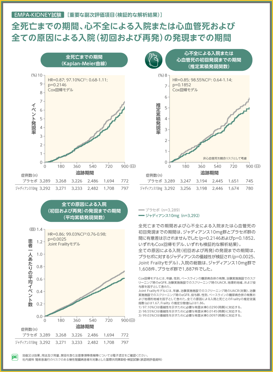 全ての原因による入院(初回および再発)の発現までの期間の、プラセボ群に対するジャディアンス10mg群のハザード比は0.86(99.03%CI:0.76~0.98)であり、 14%のイベント減少が検証されました(p=0.0025、Joint Frailtyモデル)。なお、全ての原因による入院イベントの総数は、ジャディアンス10mg群で1,608件、プラセボ群で1,887件でした。
