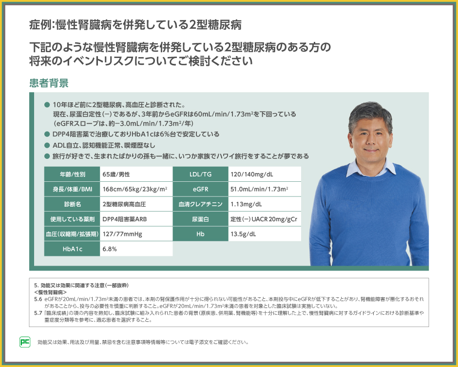 今回は、2型糖尿病があり、腎機能が低下している慢性腎臓病患者さんの現在および将来に起こりうるリスクをシミュレーションしていきます。