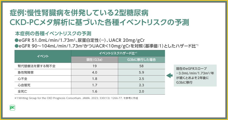 また、この患者さんでは、eGFRスロープ(1年あたりのeGFRの低下速度を示す)が約-3.0mL/min/1.73m2/年で低下し続けた場合、現在のeGFR 51mL/min/1.73m2(ステージG3a)から約2年でeGFR 45mL/min/1.73m2未満(ステージG3b)になると推定されます。