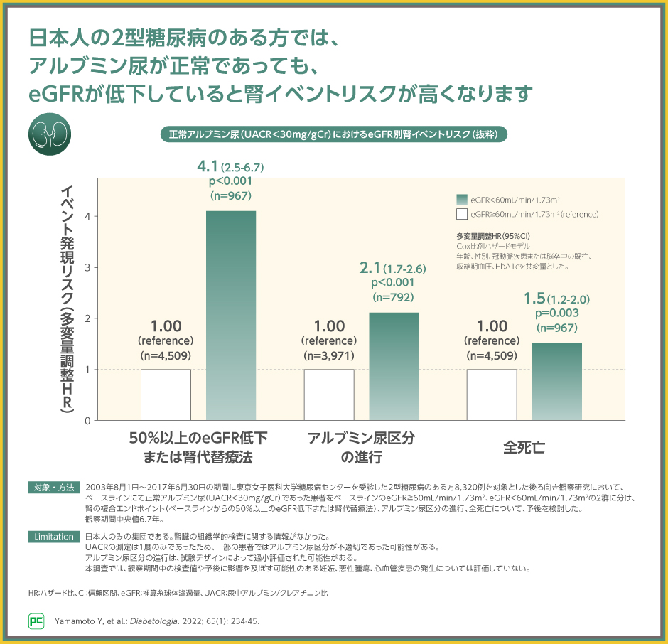 日本人の2型糖尿病があり、正常アルブミン尿(UACR<30mg/gCr)である方を対象にした国内の後ろ向き観察研究では、eGFR 60mL/min/1.73m2未満の場合、eGFR 60mL/min/1.73m2以上の場合と比べて、ベースラインからの50%以上のeGFR低下または腎代替療法の発現リスクが4.1倍、アルブミン尿区分の進行リスクが2.1倍、全死亡リスクが1.5倍になることが示されました(順にp<0.001、p<0.001、p=0.003いずれもCox比例ハザードモデル)。