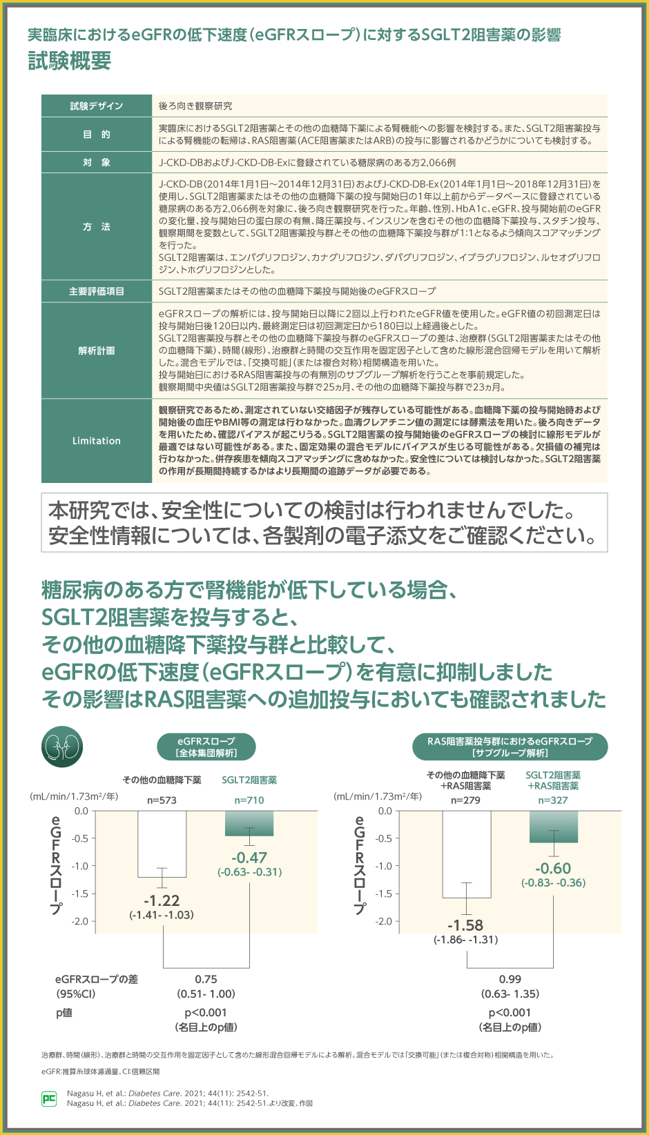 J-CKD-DBおよびJ-CKD-DB-Exに登録されている糖尿病のある方を対象とした国内の後ろ向き観察研究では、SGLT2阻害薬の投与により、その他の血糖降下薬を投与した群と比較してeGFRスロープを有意に抑制したことが示されました(p<0.001、名目上のp値、線形混合回帰モデル)。