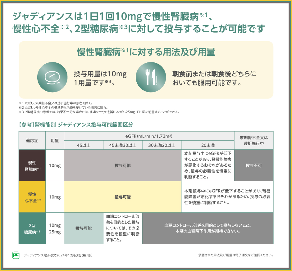 ジャディアンスは、慢性腎臓病※1、慢性心不全※2に対しては、1日1回10mg、2型糖尿病に対しては1日1回10mgまたは25mgの用量が設定されており、2型糖尿病に対しては治療強化が可能です。
