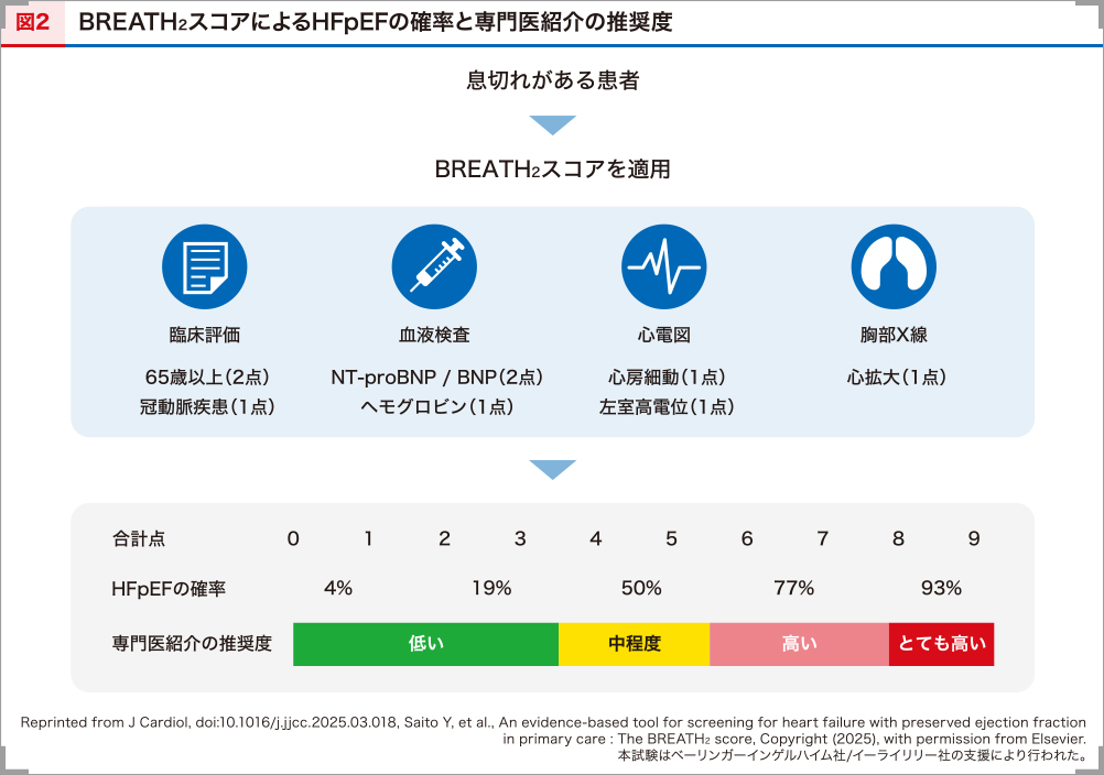 前述のように、BREATH2スコアの点数がHFpEFの可能性と連動しており、スコアが4~5点の場合、約50%の確率でHFpEFと診断されるため(図2)16)、たとえば4点を基準として専門医への紹介を検討いただくことも有効かと考えます。