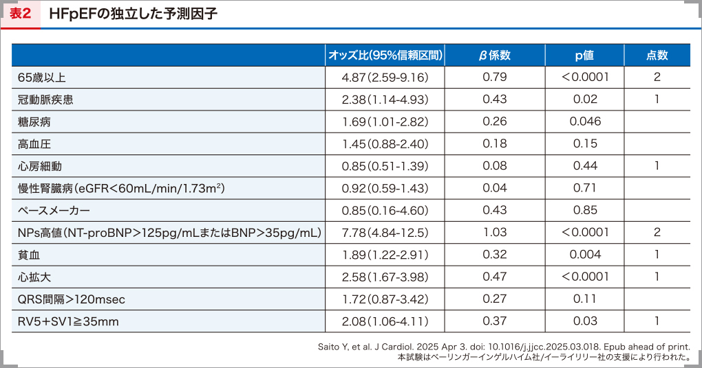 7つの評価項目を選定した背景を説明します。当院の息切れ外来に紹介された心不全が疑われる患者622例に対し、運動負荷心エコー図検査を実施しました。これにより、HFpEFと診断されたHFpEF群283例と、HFpEFではない対照群339例の患者背景を基に、多変量ロジスティック回帰分析を行いました。その結果、65歳以上、冠動脈疾患、NT-proBNP/BNP高値、貧血、胸部X線による心拡大、心電図による左室肥大の6項目が、HFpEFの独立した予測因子であることが明らかになりました(表2)16)。これに心房細動を加えた7つの項目を評価基準とし、オッズ比の大きい65歳以上とNT-proBNP/BNP高値を各2点、他の項目を各1点としました。