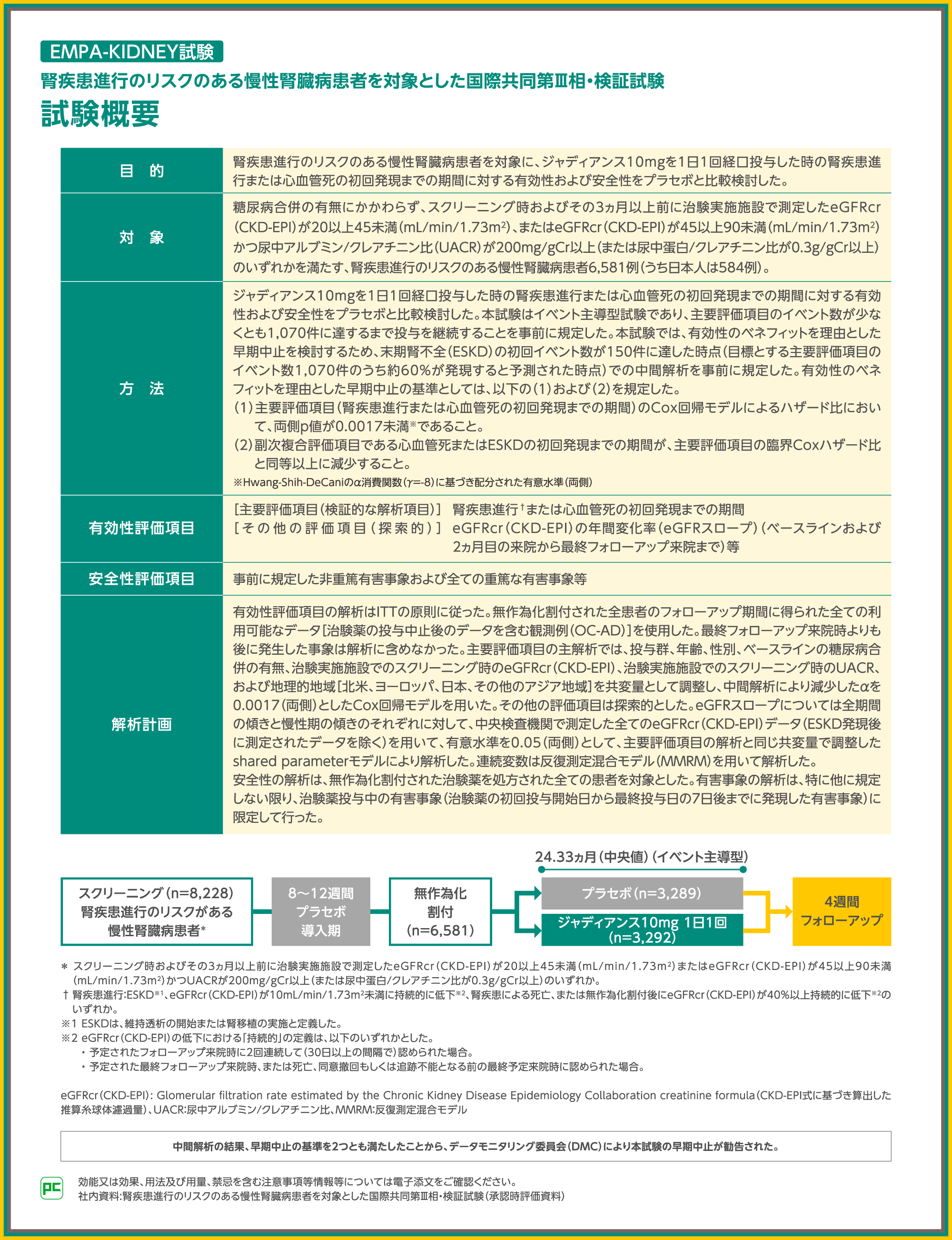 EMPA-KIDNEY試験では、スクリーニング時およびその3ヵ月以上前に治験実施施設で測定したeGFR 20以上45未満(mL/min/1.73m2)、またはeGFR 45以上90未満かつUACRが200mg/gCr以上(または尿中蛋白/クレアチニン比が0.3g/gCr以上)のいずれかを満たす、腎疾患進行のリスクのあるCKDを対象として、ジャディアンス10mgを1日1回経口投与した時の有効性および安全性をプラセボと比較検討しました。