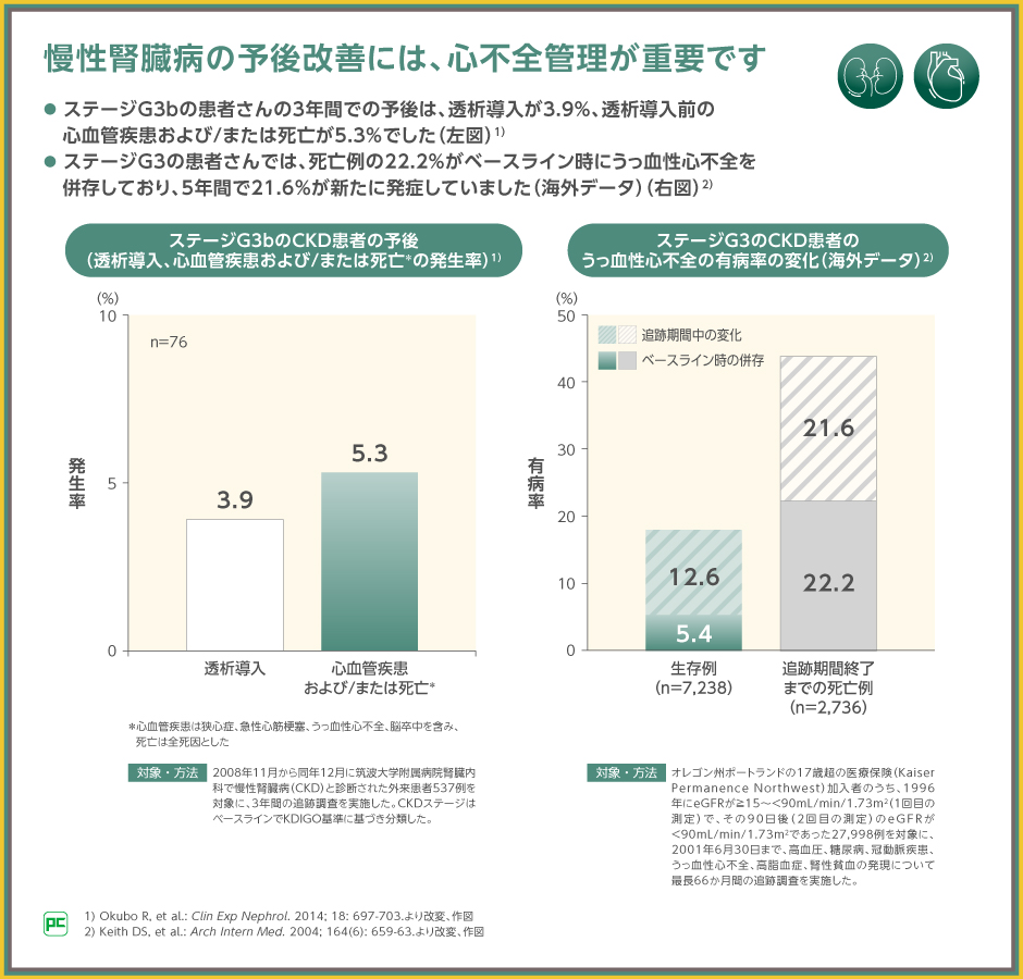 また、CKD患者27,998例を対象とした追跡調査では、ステージG3の患者さんの死亡例において22.2%がベースライン時にうっ血性心不全を併存しており、追跡期間の5年間で21.6%が新たに発症し、併存率が倍近くとなっていたという報告もあることから、CKDの予後改善には心不全の管理が重要であると考えられます。