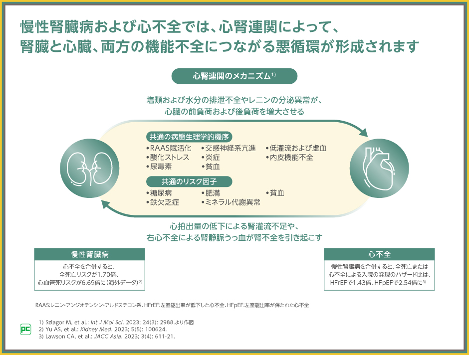 CKDと心不全は、病態生理学的な機序が共通している、疾患のリスク因子が共通しているといった特徴を有し、CKDの進展は心不全を悪化させ、心不全は腎機能低下を進行させると考えられます。