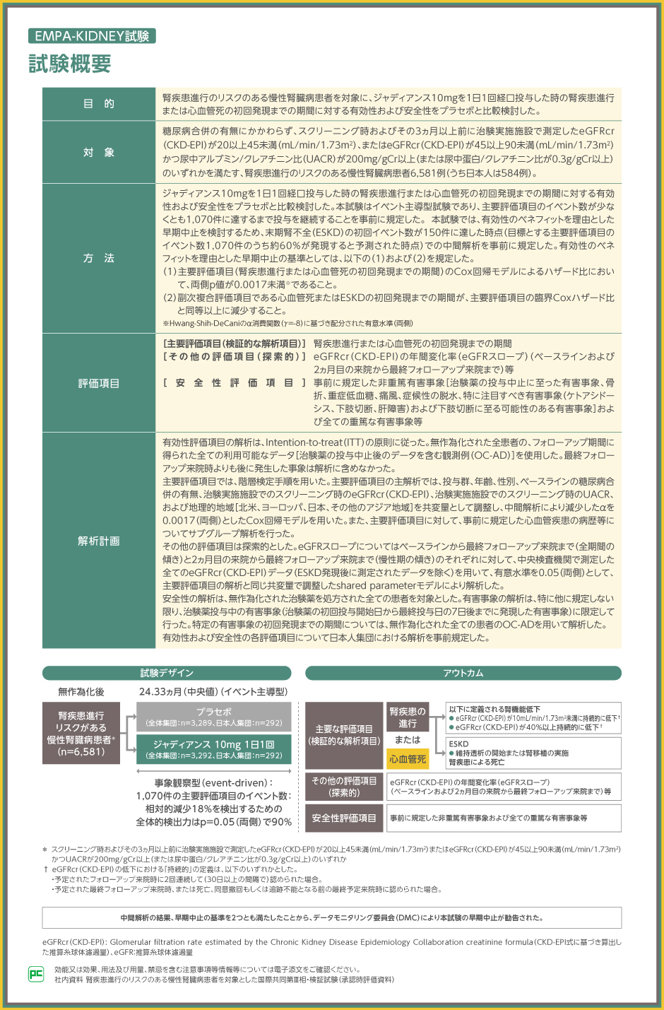 EMPA-KIDNEY試験では、CKD患者を対象として、ジャディアンス10mgを1日1回経口投与した時の有効性および安全性をプラセボ群と比較検討しました。