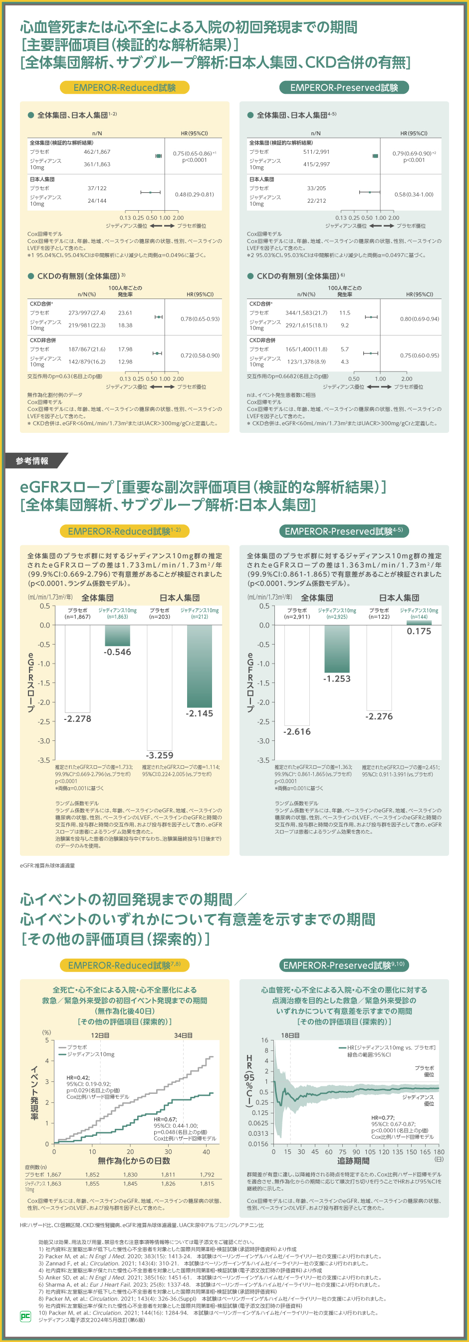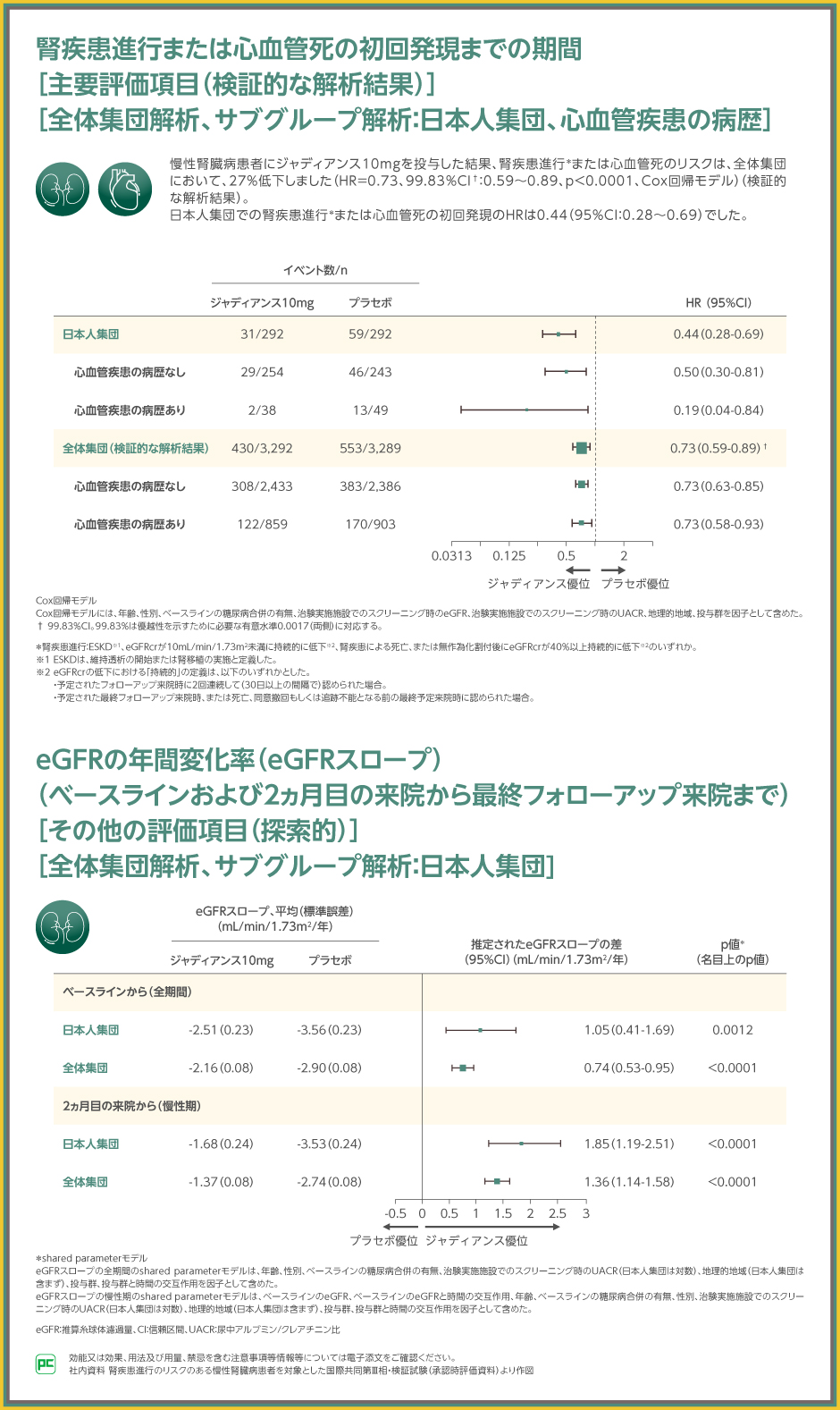 EMPEROR-Preserved試験では、全体集団における、心血管死または心不全による入院の初回発現までの期間のプラセボ群に対するジャディアンス10mg群のハザード比は0.79(95.03%CI:0.69~0.90)、p<0.001(Cox比例ハザード回帰モデル)であり、ジャディアンス10mg群の優越性が検証されました。日本人集団でのプラセボ群に対するジャディアンス10mg群のハザード比は0.58(95%CI:0.34~1.00)でした。CKD合併でのプラセボ群に対するジャディアンス10mg群のハザード比は0.80(95%CI:0.69~0.94)、CKD非合併でのプラセボ群に対するジャディアンス10mg群のハザード比は0.75(95%CI:0.60~0.95)(交互作用のp値:0.6682、名目上のp値)でした。