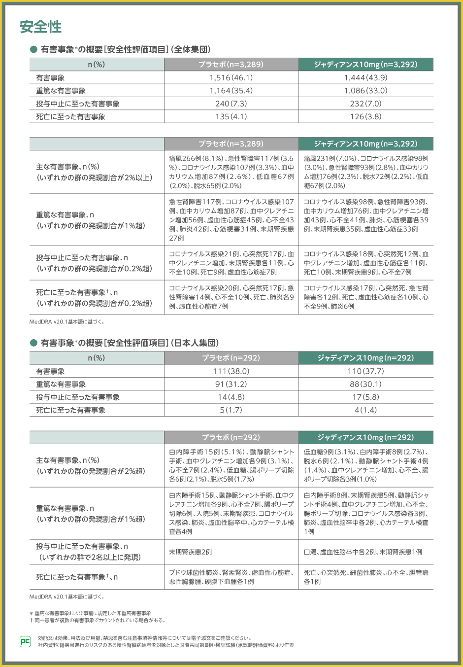 主な有害事象は、ジャディアンス10mg群で痛風231例(7.0%)、コロナウイルス感染98例(3.0%)、急性腎障害93例(2.8%)等、プラセボ群で痛風266例(8.1%)、急性腎障害117例(3.6%)、コロナウイルス感染107例(3.3%)等でした。また、重篤な有害事象は、ジャディアンス10mg群でコロナウイルス感染98例、急性腎障害93例、血中カリウム増加76例等、プラセボ群で急性腎障害117例、コロナウイルス感染107例、血中カリウム増加87例等でした。投与中止、死亡に至った有害事象は表の通りでした。