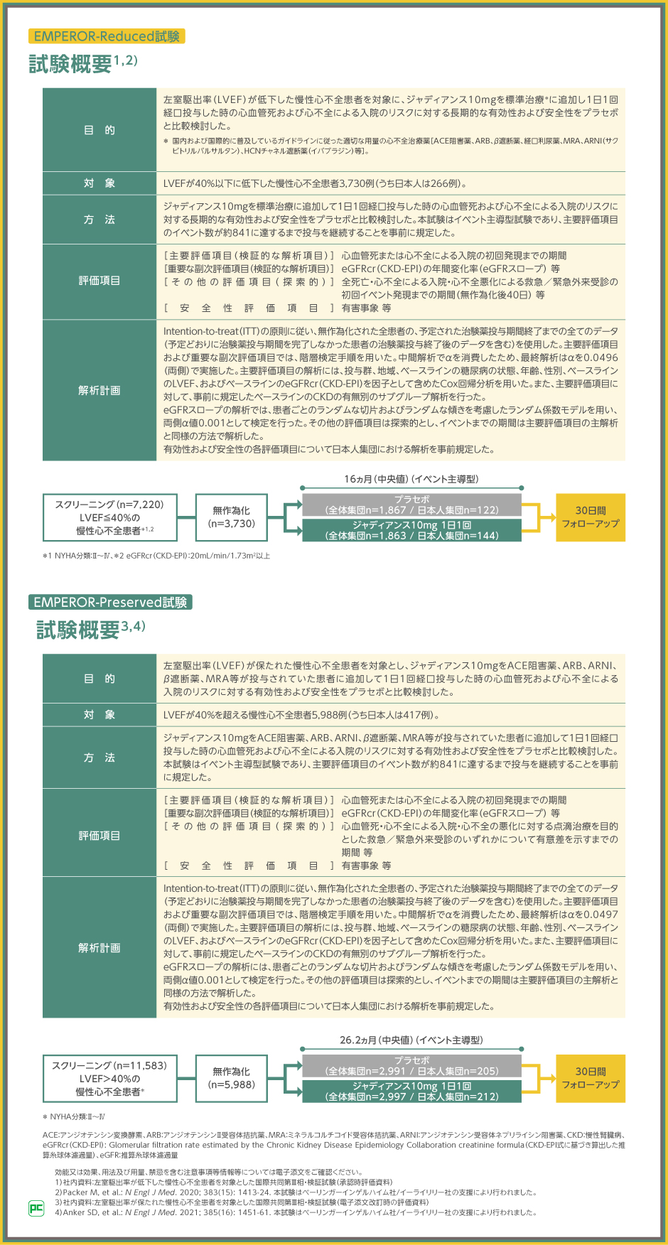ジャディアンスでは、LVEF≦40%の心不全患者を対象としたEMPEROR-Reduced試験とLVEF>40%の心不全患者を対象としたEMPEROR-Preserved試験にて、ジャディアンス10mgを1日1回経口投与した時の慢性心不全患者における有効性および安全性についてプラセボ群との比較検討を行いました。