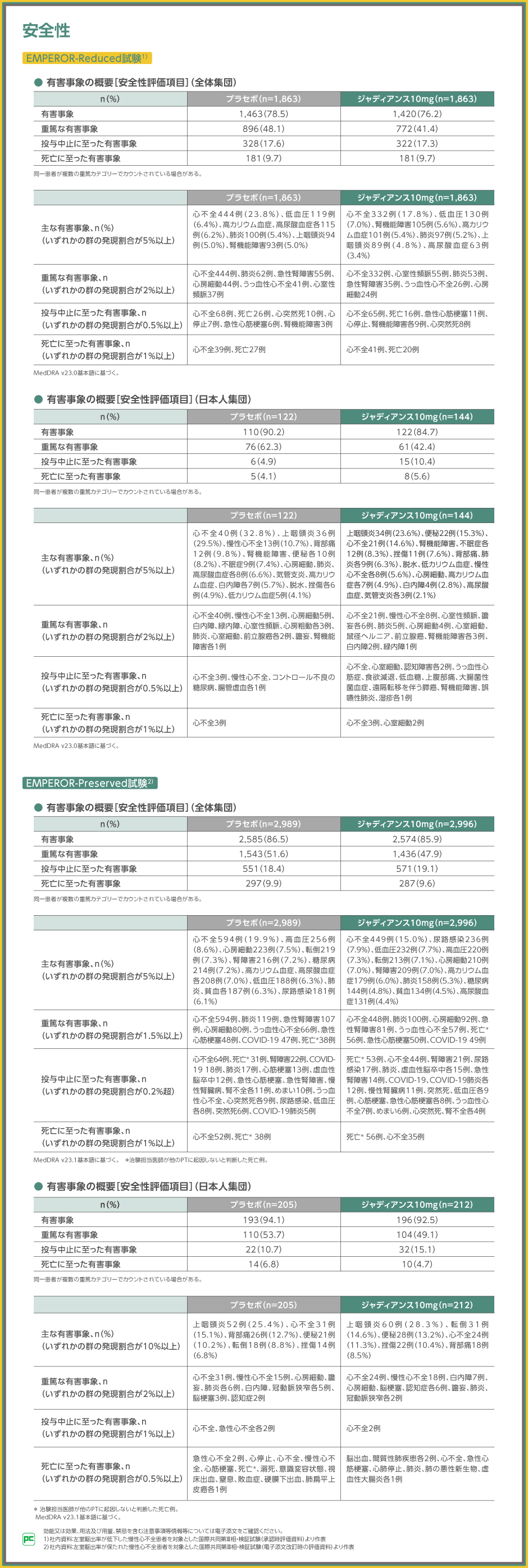 EMPEROR-Reduced試験の安全性については、全体集団での有害事象の発現割合が、ジャディアンス10mg群で76.2%(1,420/1,863例)、プラセボ群で78.5%(1,463/1,863例)でした。