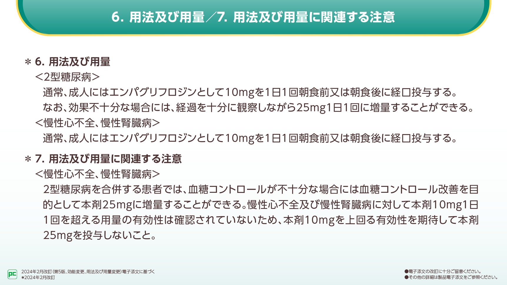 ジャディアンスでは、2型糖尿病および慢性心不全※1においても、通常、10mgを1日1回朝食前又は朝食後に経口投与するとされています※3。