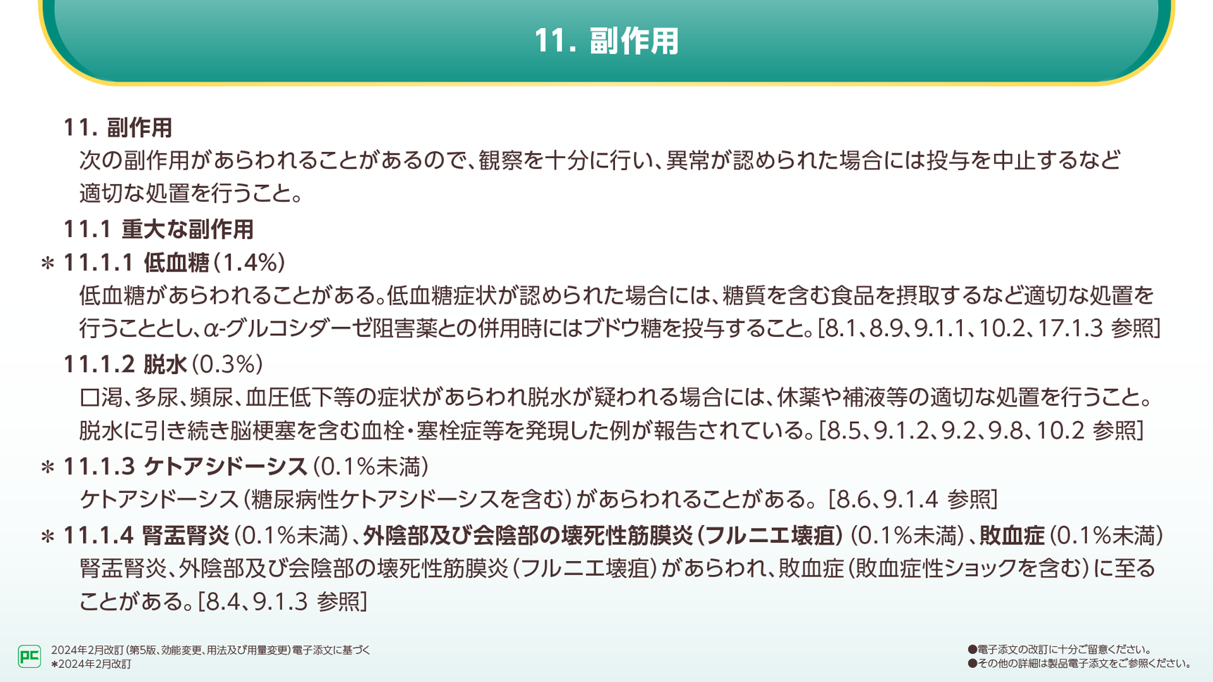 ジャディアンスの重大な副作用は、低血糖(1.4%)、脱水(0.3%)、ケトアシドーシス(0.1%未満)、腎盂腎炎(0.1%未満)、外陰部及び会陰部の壊死性筋膜炎(フルニエ壊疽)(0.1%未満)、敗血症(0.1%未満)が電子添文上に記載されています。